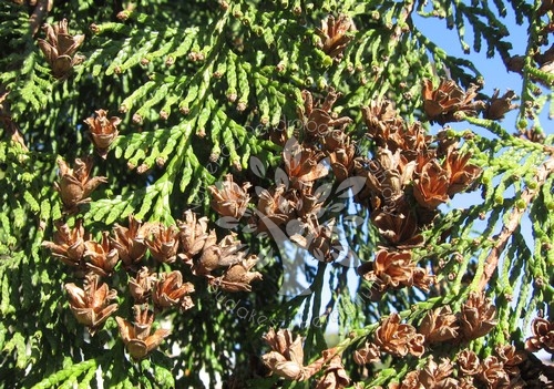 Észak-Amerika nyugati csapadékos vidékeiről származó nagyméretű 15-20 méteres, széles, kúpos koronát nevelő pikkelylevelű. Széles, csillogóan fényes pikkelyleveleinek fonákja világoszöld, fehér rajzolatú.